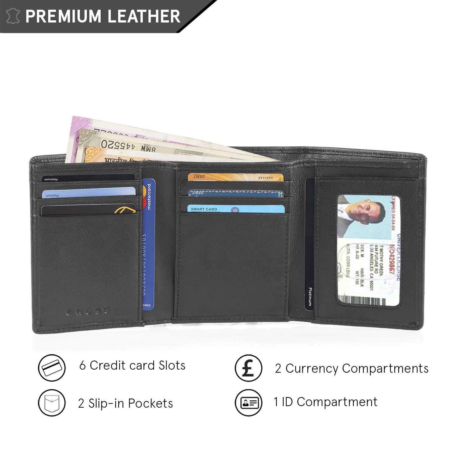 PRODUCT FEATURES: Authentic Cross Branded wallet made with 100% Genuine Leather. Includes 5 Credit Card Slots with 1 ID Window, 2 Secret Compartments, 2 Full Length Currency Compartments & 2 Slip-in Pockets.
