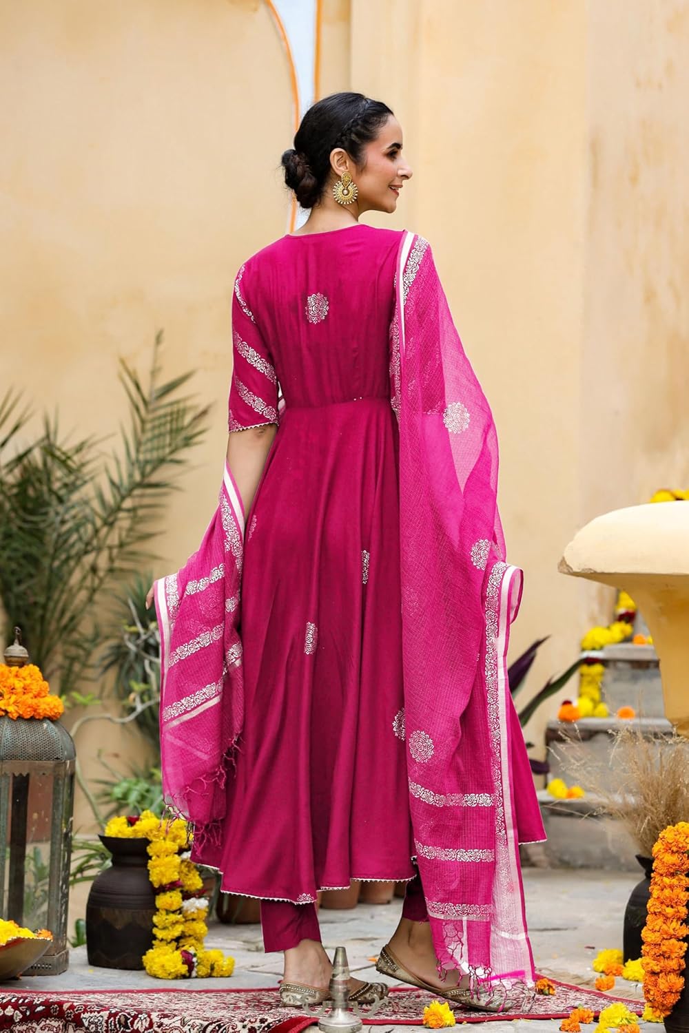GoSriKi Women’s Cotton Blend Printed Anarkali Kurta with Pant & Dupatta (BERLIN WINE-GS_3XL_Wine_XXX-Large)